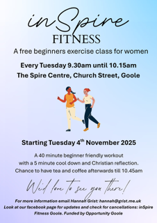 InSpire Fitness is launching a new free weekly beginners exercise class for women, designed to help you move, stretch, and build confidence in a welcoming environment. Whether you're new to exercise or looking to get back into a routine, these sessions are a great place to start.
