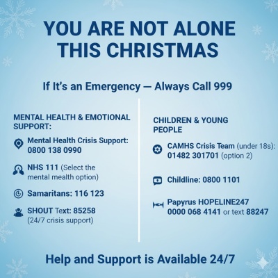 - CAMHS Crisis Team (under 18s): 01482 301701 (option 2) — available 24/7 for young people in emotional crisis.