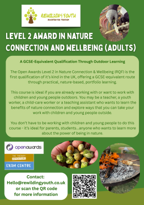 Regulated through Open Awards and equivalent to a GCSE, this Level 2 Award provides a structured pathway to explore how nature connection supports mental health, wellbeing and positive environmental behaviours.