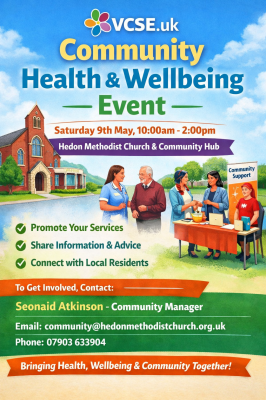 Hedon Methodist Church and Community Hub will be hosting a Community Health & Wellbeing Event on Saturday 9th May, 10am – 2pm, bringing together local groups, services and residents for a day focused on improving health, wellbeing and community connection.